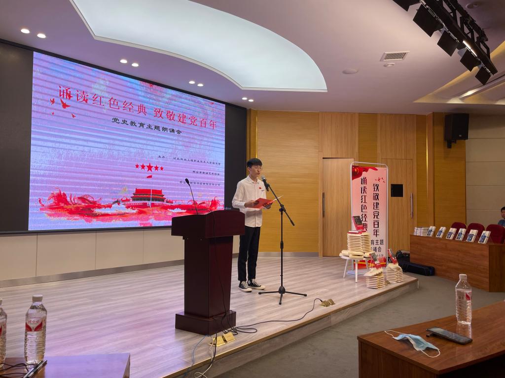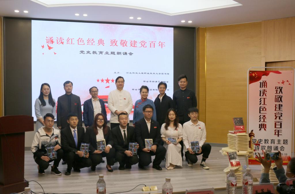本次朗诵会以经典诵读为主,穿插有阐述图书造型寓意、党史快问快答环节。365官网学生和邢台市朗诵艺术协会老师们以饱满的热情朗诵《红色经典》、《可爱的中国》、《我》、《建党百年,传递红色精神》、《中国梦龙图腾》、《沁园春长沙》、《在欢呼的人群中》等作品,为大家再现出一幅幅红色画卷。