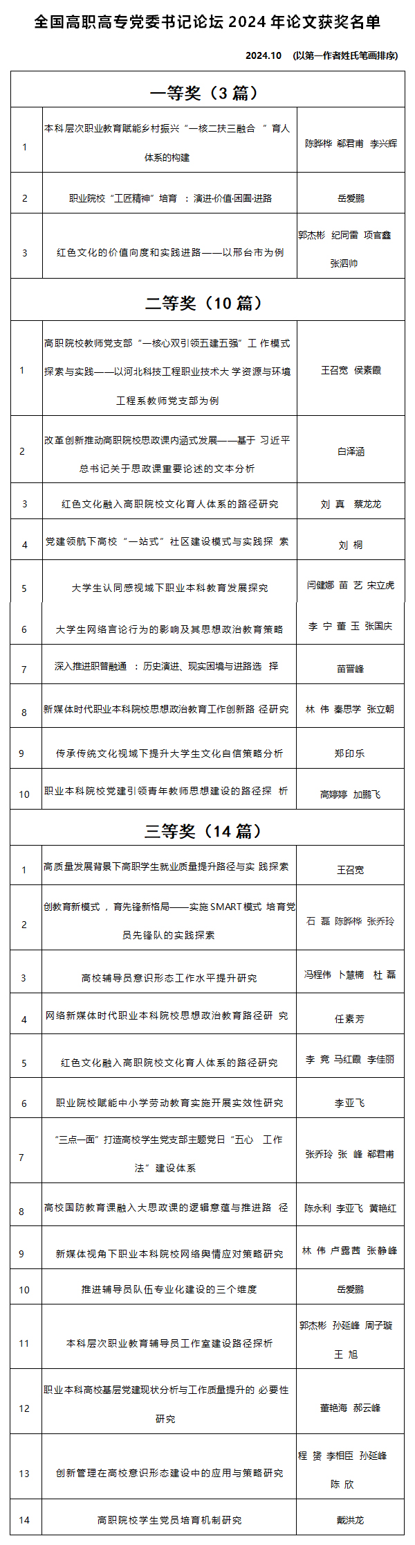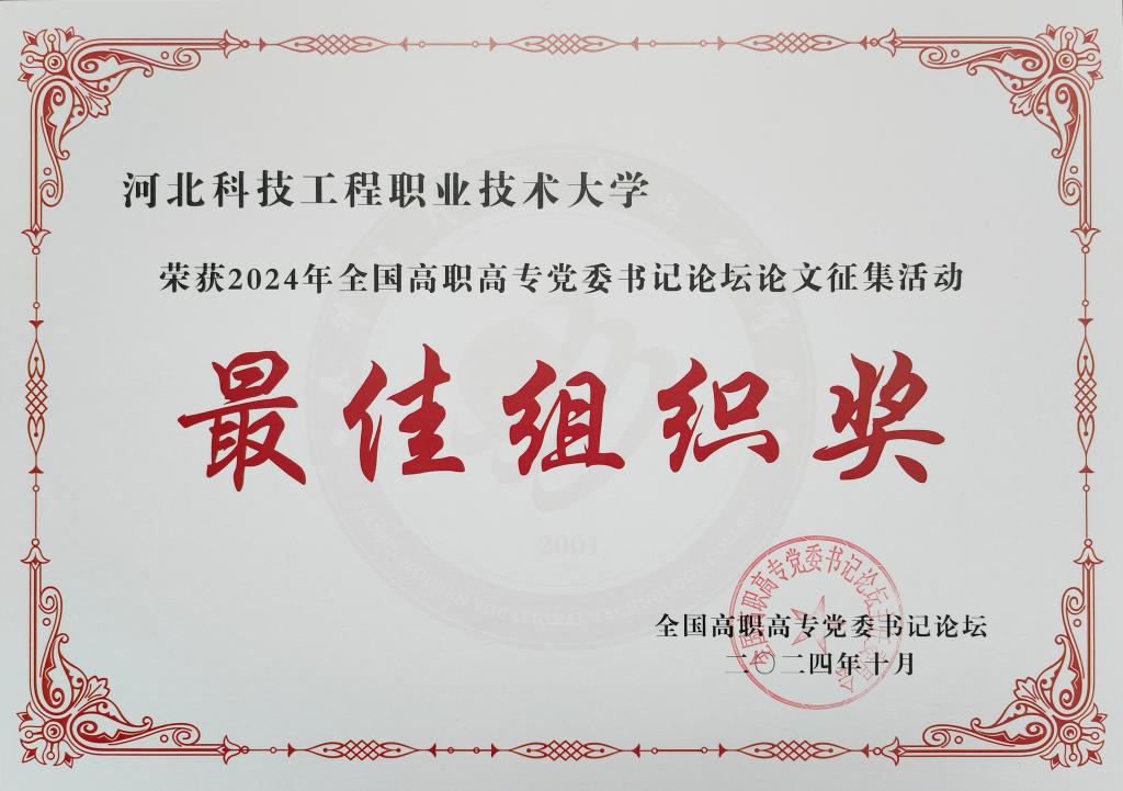 10月25日-27日,全国高职高专党委书记论坛2024年会在天津举办。会上通报了本年度学术论文评审情况,并对22个最佳组织奖院校进行了表彰。今年6月至8月,全国高职高专党委书记论坛举办了2024年论文征集活动,共收到论文768篇,最终评选出一等奖论文81篇,二等奖论文151篇,三等奖论文248篇。365官网27篇论文获奖,论文质量和获奖数量均居全国高职院校前列,荣获最佳组织奖,这是365官网连续第六年获此殊荣。