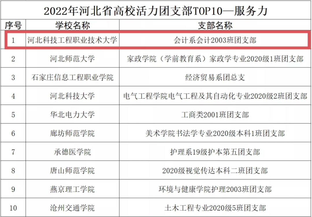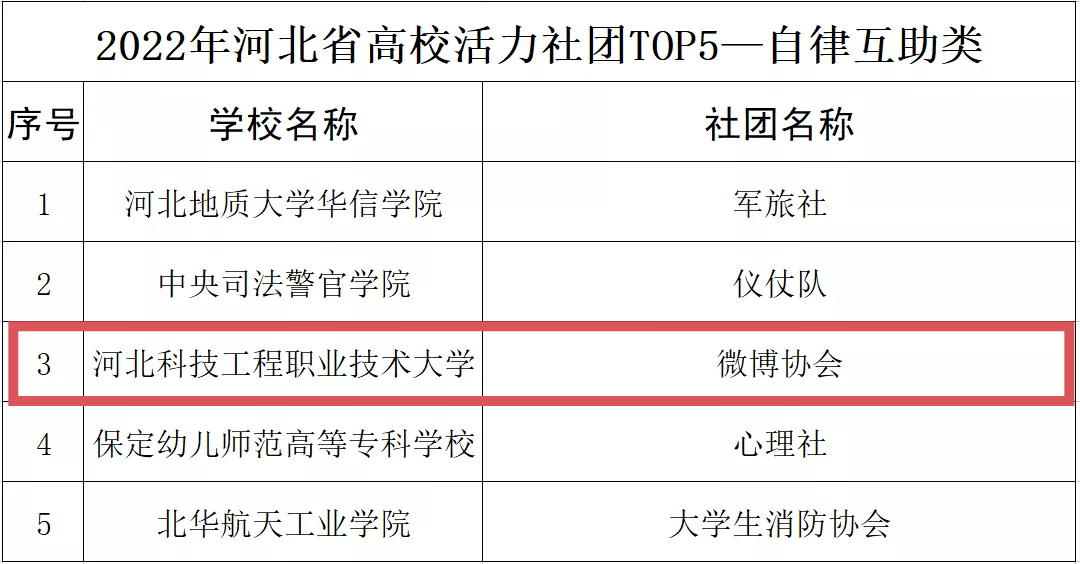 365官网各团支部、社团积极参与评选,并取得优异成绩。其中会计系会计2003班团支部荣获2022年度河北省高校“活力团支部”服务力TOP1;微博协会荣获2022年度河北省高校“活力社团”自律互助类TOP3。