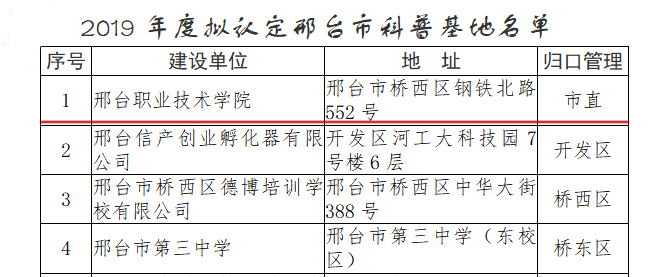 近日,邢台市科学技术局公布了2019年度拟认定市级科普基地名单,我院上榜。