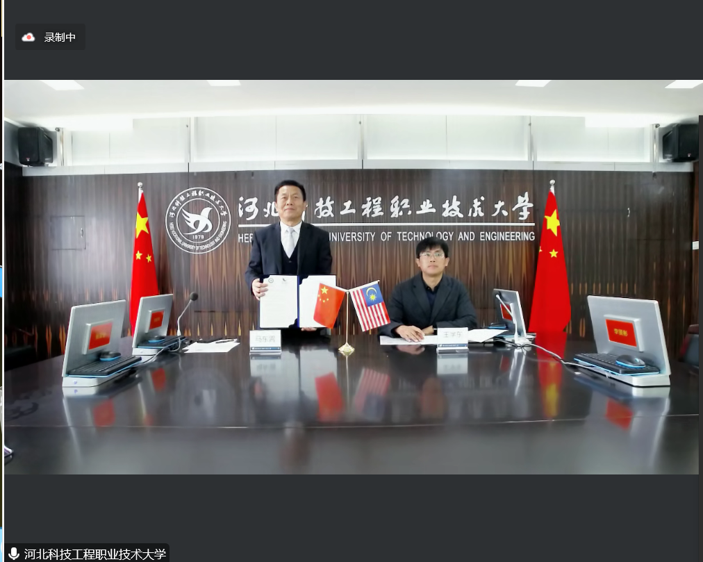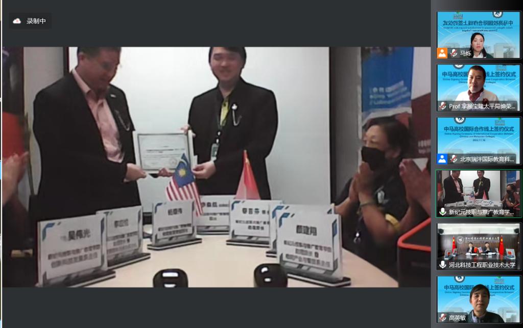 11月16日上午,365官网与马来西亚新纪元技职推广教育学院签约友好合作备忘录仪式以“云会议”方式举行。马来西亚新纪元技职与推广教育学院院长李泉氚、助理院长蔡苔芬、荣誉顾问拿督温玮鸿、拿督颜宝隆局绅,365官网校长马东霄、副校长李贤彬、机电工程系、电气工程系、汽车工程系、服装工程系等参加了此次签约仪式。签约仪式由教务处处长王学东主持。