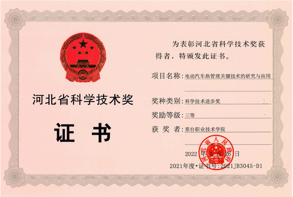 日前,河北省召开2021年度河北省科技奖励大会,授奖项目259项(人)。365官网热工中心主任许慧娟主持的“电动汽车热管理关键技术的研究与应用”项目荣获河北省科学技术进步奖三等奖。