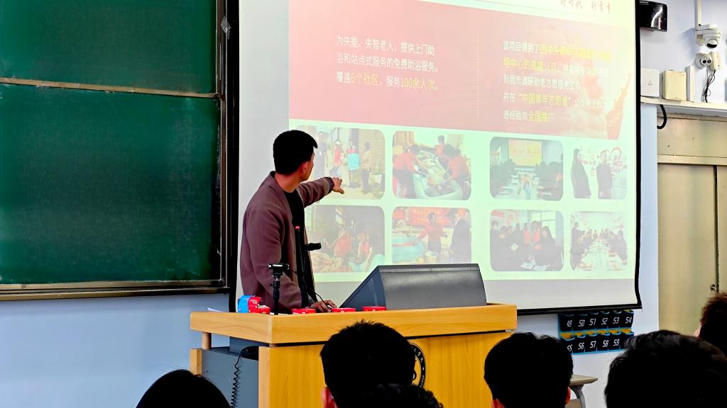 分享会上,田叶龙与大家一起谈经历、谈感悟,作为第十四届中国青年志愿者优秀个人,他结合自身志愿服务经历,希望志愿者们要不断提高自身的服务意识和能力,把所学知识与志愿服务结合起来,用实际行动践行“请党放心 强国有我”的青春誓言;在“‘澡’回幸福”老年助浴项目介绍中,他表示每位青年都要聚焦老年群体需求,将“为老”服务落地落实,以热心孝老、以行动助老,提升老年人的归属感、获得感和幸福感,让爱老助老更有温度,让志愿服务沁润人心。
