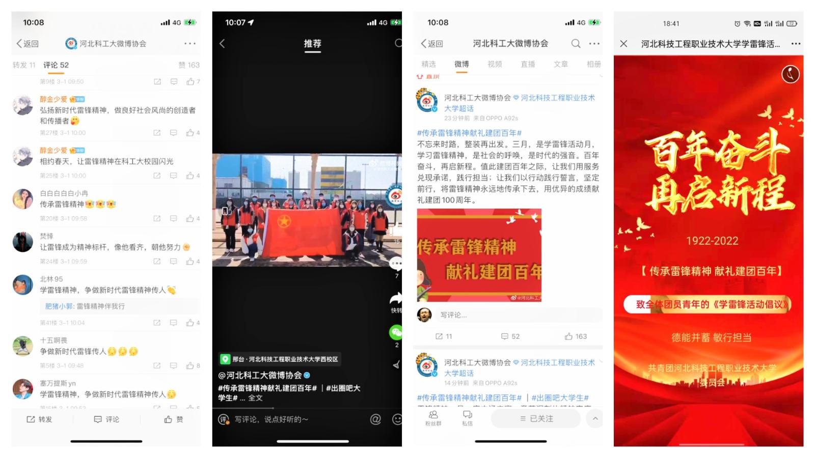 2月28日,学校团委发布了《关于开展“传承雷锋精神 献礼建团百年”雷锋月主题教育实践活动的通知》《百年奋斗、再启新程——致全体团员青年的学雷锋活动倡议》,动员倡议各级团组织、广大团员青年积极组织参与各类“雷锋月”活动,向榜样学习,奋进新时代。