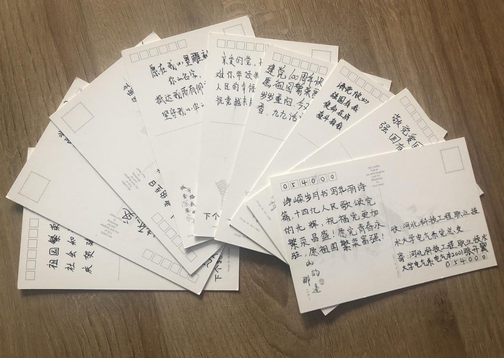 下午五时三十分,活动在浓厚的节日氛围中拉开帷幕。现场有重阳节明信片书写、抽奖、条幅签名等活动环节。有趣的活动形式吸引了各系同学的积极参加,现场热闹非凡。来自五湖四海思乡情切的科工大学子以书写明信片的方式,寄出对家人深深的节日祝福。活动还为本系入党积极分子和学生党员提供明信片,同学们纷纷在明信片上表达了对百年大党的美好祝愿。活动结束后,工作人员会将同学们的明信片统一贴好邮票邮寄出去。