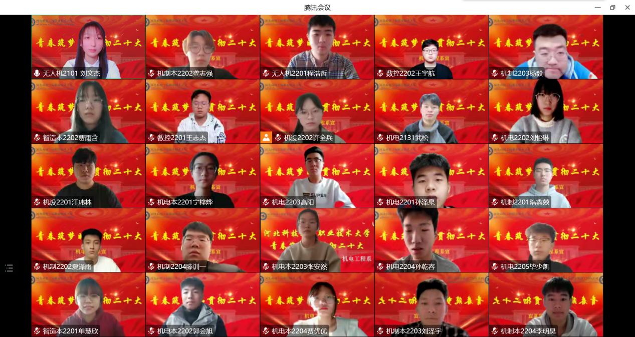 为深入学习贯彻党的二十大精神,教育引导广大团员青年坚定不移听党话、跟党走,踔厉奋发、勇毅前行,争做新时代好青年,努力成长为堪当民族复兴重任的时代新人。近日,机电工程系团总支开展了“青春筑梦时·学习二十大”系列主题主题线上团日活动。