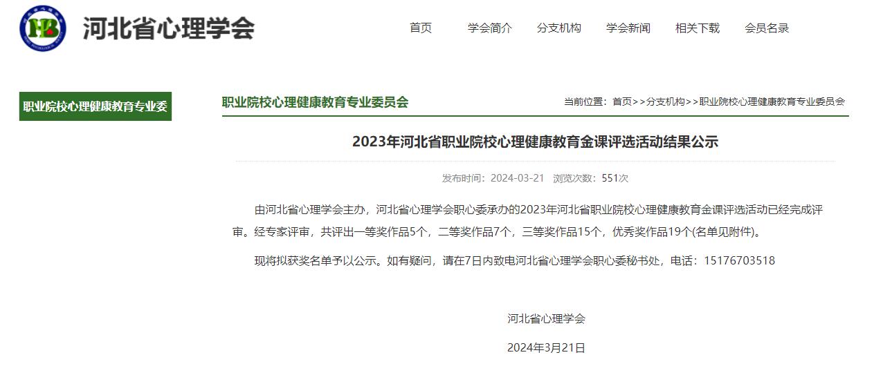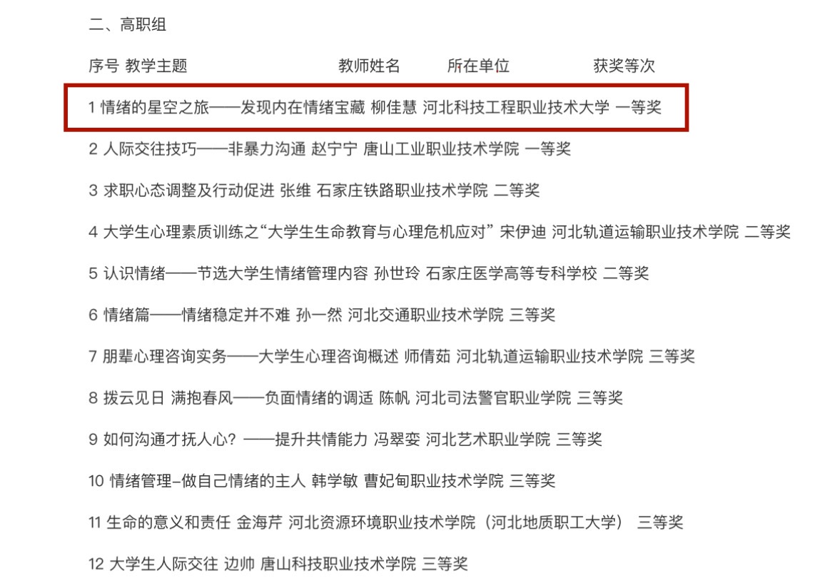 近日,由河北省心理学会主办,河北省心理学会职心委承办的2023年河北省职业院校心理健康教育金课评选活动已完成评审并进行结果公示,365官网学生工作处心理健康教育中心柳佳慧老师的作品《情绪的星空之旅——探索内在情绪宝藏》获评高职组一等奖。