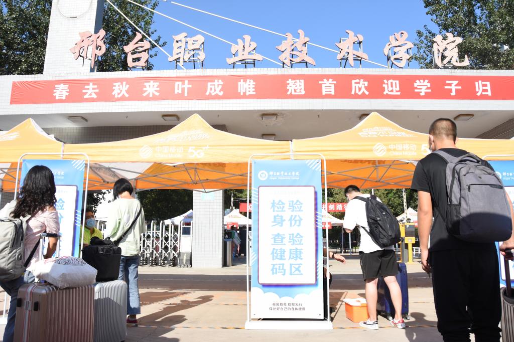 昨日刚下过雨的天气晴好,老师们早早在校门口等待着学生归来。警戒线外按照规定间隔站着手拿行李的学生,阳光照在他们的脸上更显灿烂。学院工作人员在校门口、学生公寓等地设置多个服务点,依次对每一位学生进行行李消毒、体温检测、身份及健康码核验、系部报到等流程。“欢迎回家!”老师们用充足的准备和贴心的服务迎接着每一位邢职学子。