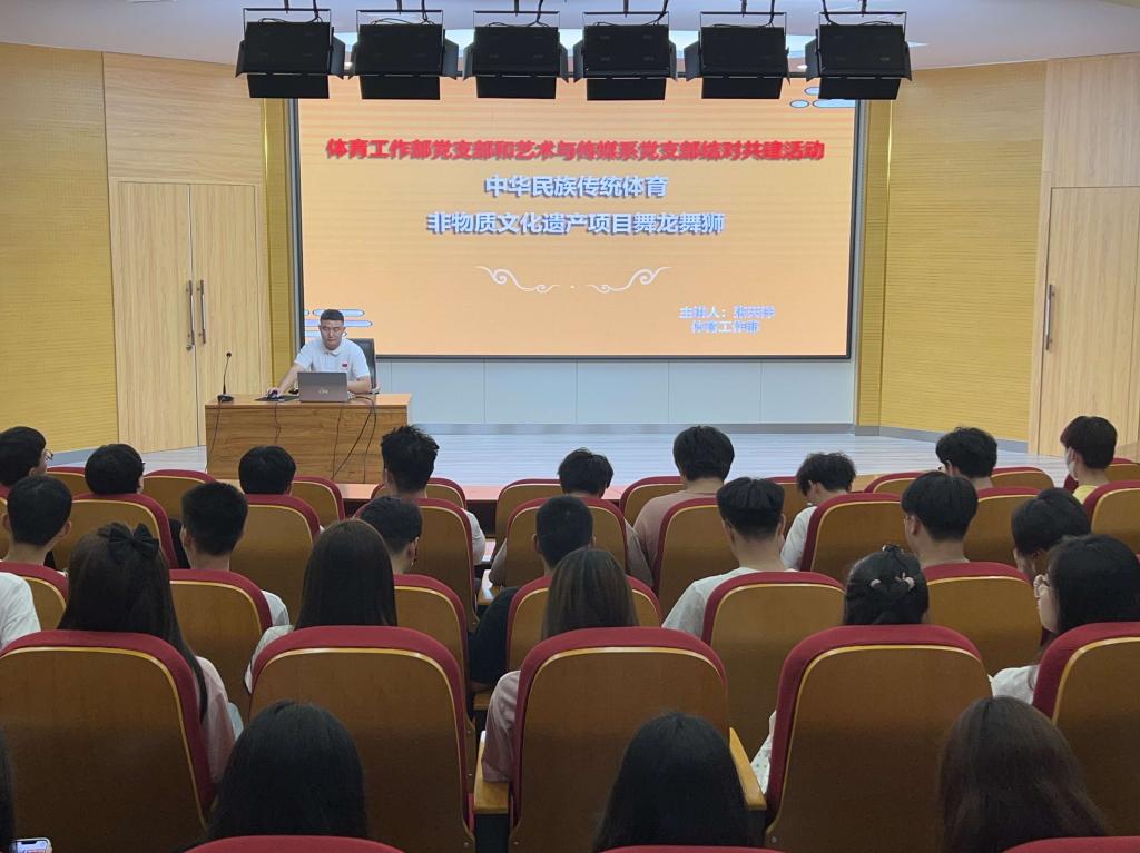 为贯彻落实党的二十大精神,深入开展学习贯彻习近平新时代中国特色社会主义思想主题教育,深入做好学校党支部结对共建工作,更好的传承与发扬中华优秀传统文化,打造健康向上的校园体育文化氛围,6月16日,365官网体育工作部党支部和艺术系学生党支部在图书馆学术报告厅举办结对共建座谈会,内容主要为中华民族传统体育非物质文化遗产项目舞龙舞狮。