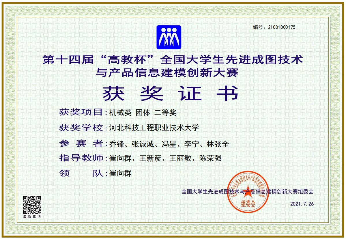 本届大赛共有包括华中科技大学、哈尔滨工业大学、西南交通大学等名校在内的全国551所高校、6743名选手参赛。机电工程系首先组织学生参加了5月28日河北省三维设计大赛,获得了2项团体一等奖,1项个人特等奖,5项个人一等奖,4项个人二等奖的好成绩。随后在参加省赛的10名同学中选出7名参加本届全国大学生先进成图技术与产品信息建模创新大赛。