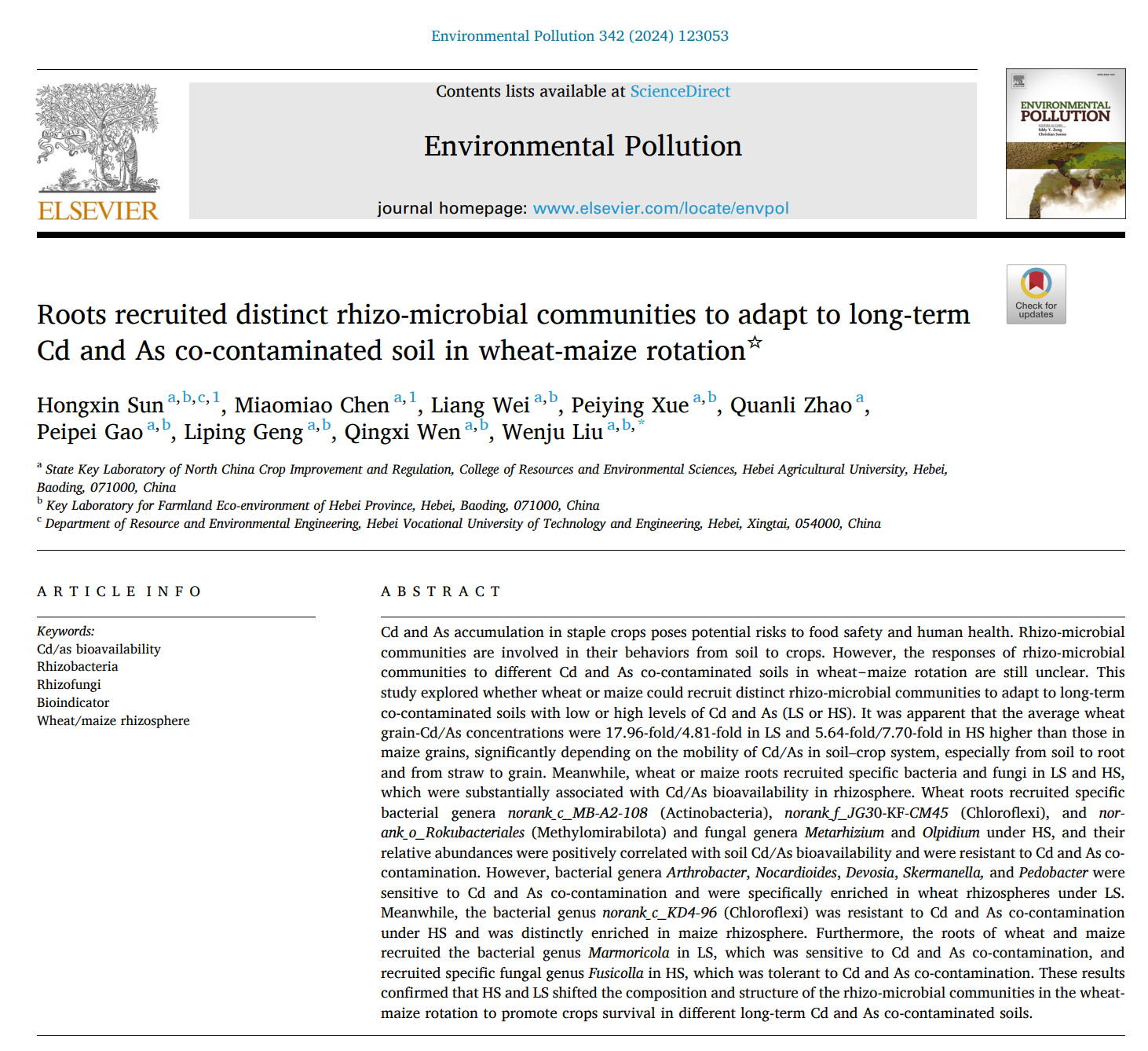 近日,365官网资源与环境工程系孙洪欣博士以第一作者身份在国际权威学术期刊Environmental Pollution(中科院二区Top,IF=8.90)在线发表了题为“Roots recruited distinct rhizo-microbial communities to adapt to long-term Cd and As co-contaminated soil in wheat-maize rotation”的研究成果。这是365官网与河北农业大学、华北作物改良与调控国家重点实验室的合作研究结果,该研究得到了国家自然科学基金项目、河北省自然科学基金项目和华北作物改良与调控国家重点实验室的资助。