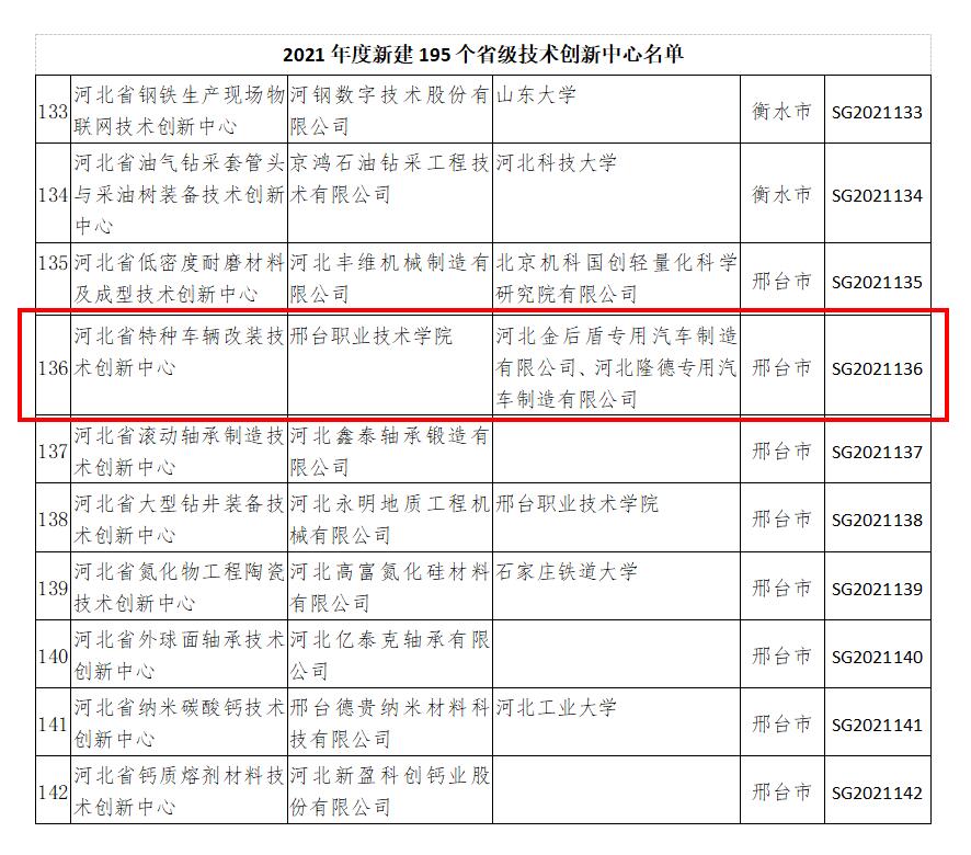 “河北省特种车辆改装技术创新中心”主要依托邢台规模以上企业河北金后盾专用汽车制造有限公司和河北隆德专用汽车制造有限公司联合共建。该中心聚焦特种车结构优化设计、智能化技术及能源管理技术三个方向,与共建企业主要开展关键共性技术研发和先进技术集成联合攻关,为产业化提供成熟、配套的技术、标准、工艺、装备和新产品,推动科技成果转移转化和专业化技术人才培养,助推我省特种车辆改装企业转型升级。