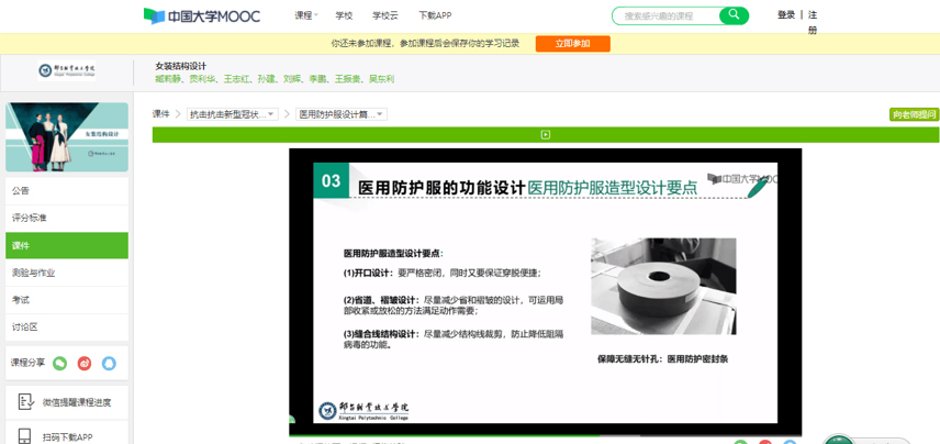 自新型冠状病毒肺炎疫情发生以来,全国人民齐心协力,抗击疫情。根据学院“停课不停学”整体安排,为减小疫情对学生学业带来的影响,服装工程系积极利用自建MOOC、资源库、优质平台资源及在线直播等形式按课表开展线上教学,并录制“医用防护服系列”微课视频,为抗击疫情贡献力量。