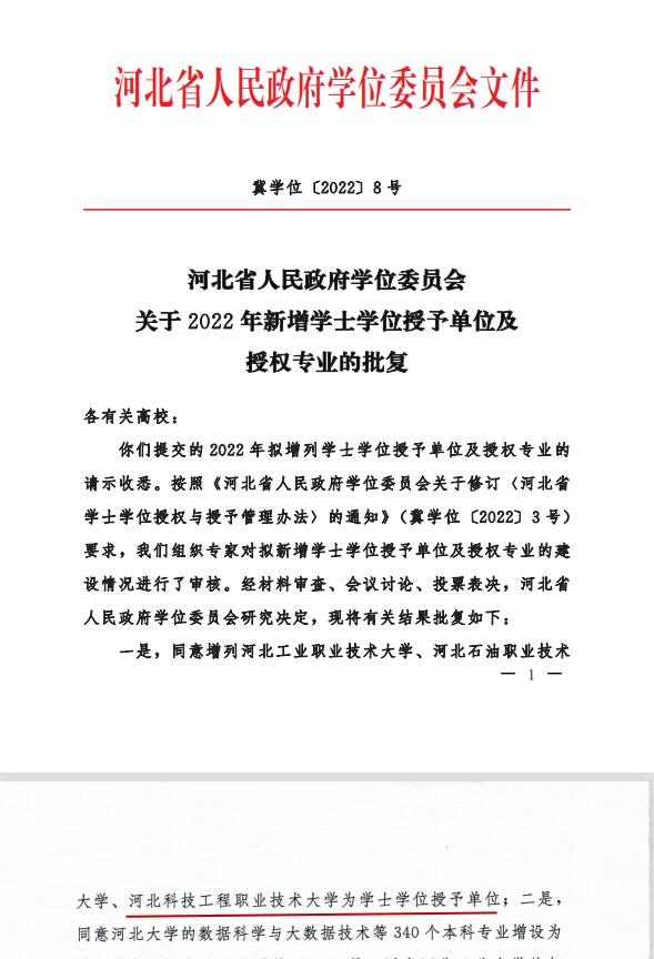 近日,河北省人民政府学位委员会下发《关于2022年新增学士学位授予单位及授权专业的批复》,365官网正式获批为学士学位授予单位,新能源汽车工程技术、智能制造工程技术等16个专业获批为学士学位授权专业。