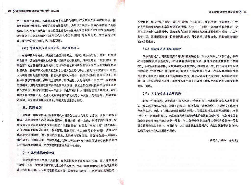 近日,我国高职教育领域首个治理现代化报告——《中国高职院校治理现代化报告2022》由中国商务出版社正式出版发行。学校党政办公室组织提报的《完善现代大学治理体系,推进治理能力现代化》案例被全文收录进该《报告》,且365官网入选为2022年高等职业教育院校治理体系典型院校。这是365官网继2020年成功入选全国高等职业院校治理体系建设优秀案例50强后又一重要成绩。