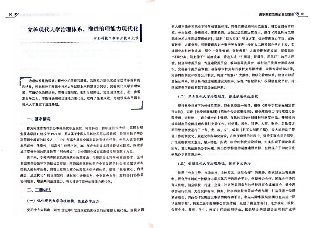 近年来,学校响应国家治理现代化改革要求,围绕职业本科学校建设要求,完善以章程为核心的现代大学治理体系,搭建“党委核心、内外融合、递进优化”的治理架构,完善现代大学治理制度,通过师生合作参与、企业联合办学、政府部门协作等协同创新,增强共同治理能力,有力推进了院校治理能力现代化,取得了突出成绩:成为河北省首批职业本科学校,综合实力跃升明显,发展动力更加强劲,品牌特色进一步彰显。光明日报、中国青年报、中国教育报、新华社等各级各类主流媒体近800次报道学校办学情况和办学成就,学校知名度和影响力进一步增强。