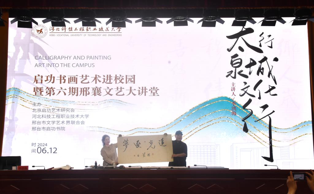 6月12日下午,太行泉城文化行——启功书画艺术进校园暨第六期邢襄文艺大讲堂在学校开讲。本次大讲堂特邀北京启功艺术研究会副会长、著名书法家李洪海先生带来书法课堂。校长马东霄、副校长赵建光、市启功书院院长傅恒杰以及市文联文艺界代表、365官网师生代表300余人参加活动。
