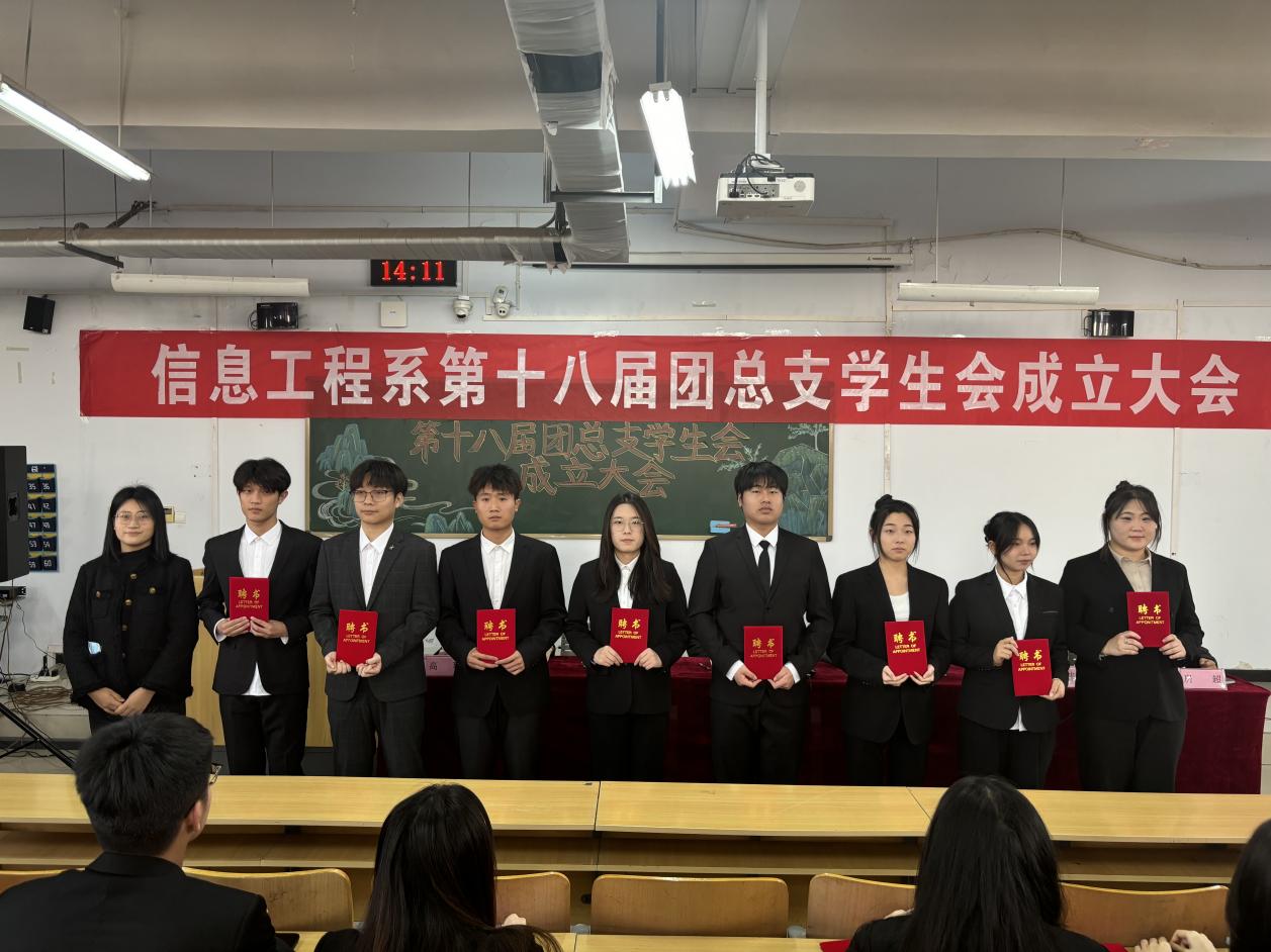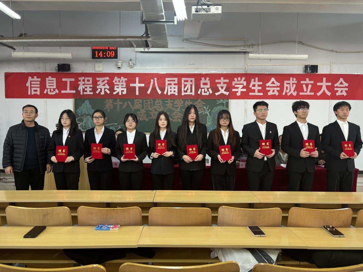 会议伊始,全体起立奏唱团歌《光荣啊,中国共青团》。随后,张玉丹老师宣读了《信息工程系关于第一届党团服务中心学生干部任命的决定》、孙新博老师宣读了《信息工程系关于第十八届团总支学生会干部任命的决定》、钱伟老师宣读了《信息工程系关于2024级班委任命的决定》。徐建平书记和各位老师分别为第十八届团总支学生会主要干部代表、2024级班干部代表颁发了聘书。王媛媛代表系第十七届团总支学生会作卸任发言,她表示时光如白驹过隙,过去一年的团总支学生会生活充实丰富,收获了成长和经验,并对新一届团总支学生会送出衷心的祝贺和美好的祝福。随后安逸冉代表第十八届团总支学生会作上任发言,她表示新一届的团总支学生会将传递第十七届团总支学生会的荣誉,传承优秀品质,秉持初心,团结一致,为信息工程系发展贡献力量。