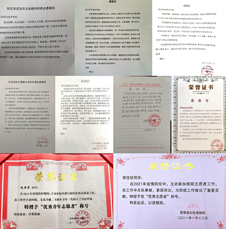 近日,我系收到来自中共八方村党支部、邢秋口村委会、昌黎县妇幼保健院等多个基层单位的表扬信和感谢信,各单位纷纷对我系学生踊跃投身家乡疫情防控志愿服务的行为表示肯定和感谢。