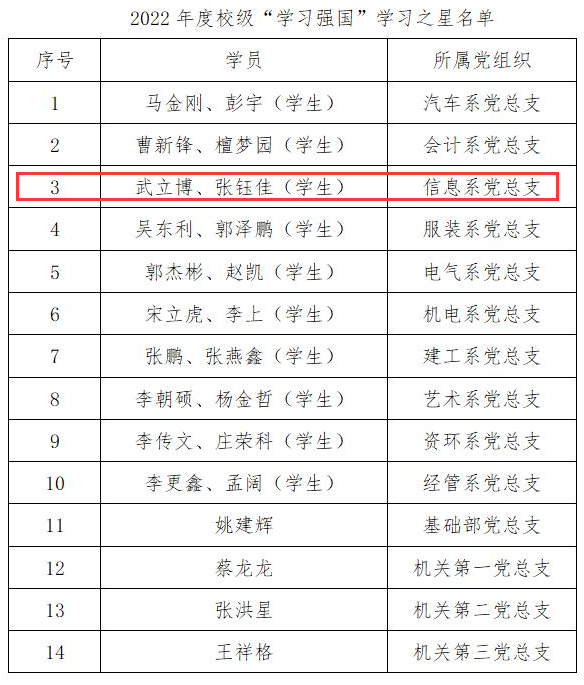 “学习强国”学习平台是中宣部主办的立足全党、面向全社会的科学理论学习阵地和思想文化聚合平台。经各地各单位逐级推荐、业务部门审核把关,我系朱振琢老师被邢台市授予2022年度“学习强国”学习之星荣誉称号。同时,学校综合全校“学习强国”学习平台学员参与度、活跃度和学习积分等相关情况,授予我系党总支副书记武立博、2020级学生张钰佳2022年度校级“学习强国”学习之星荣誉称号。