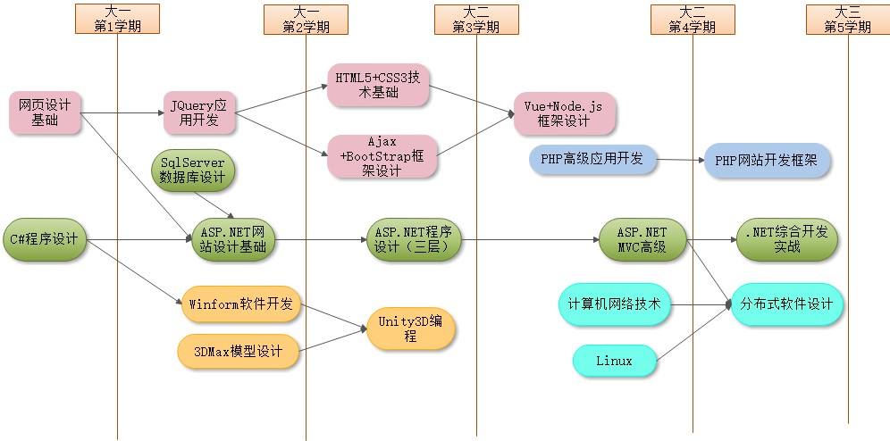 软件技术专业课程涵盖了国家专业标准中的“Web前端方向”和“.NET软件开发方向”,融入了VR虚拟设计大赛和分布式软件设计的相关课程,其专业课程生态体系分布如下: