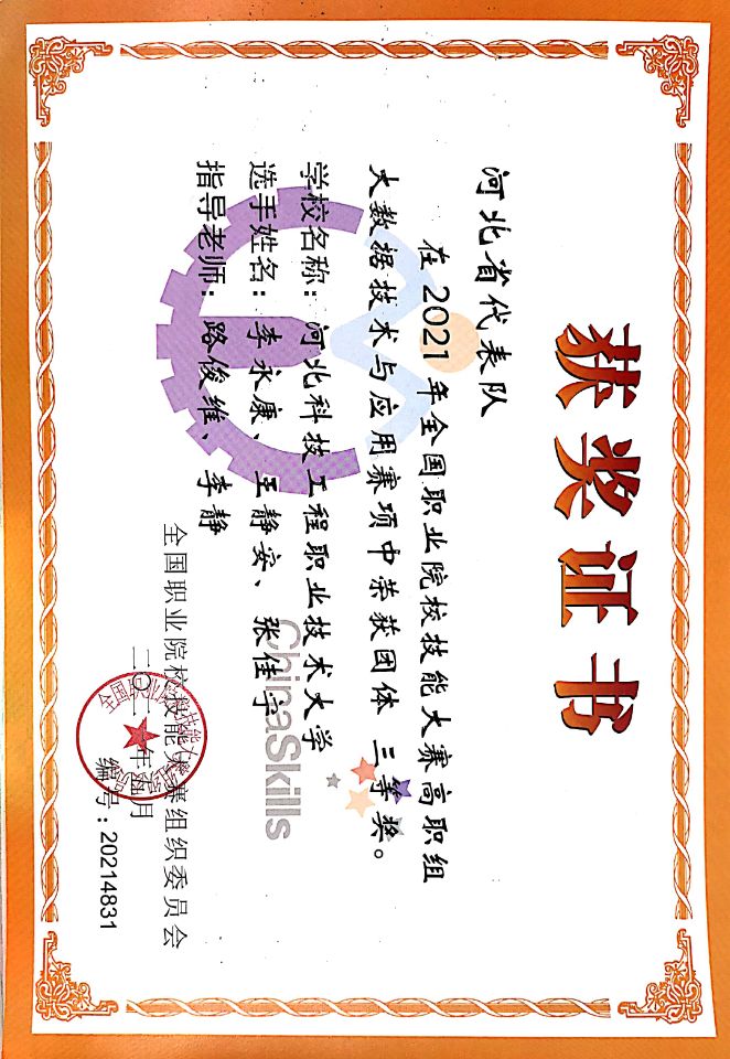 图:2021年全国职业院校技能大赛大数据技术与应用全国三等奖