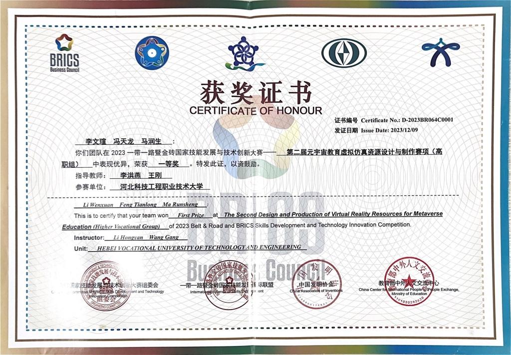 图:2023年一带一路暨金砖国家大赛虚拟仿真赛项全国一等奖