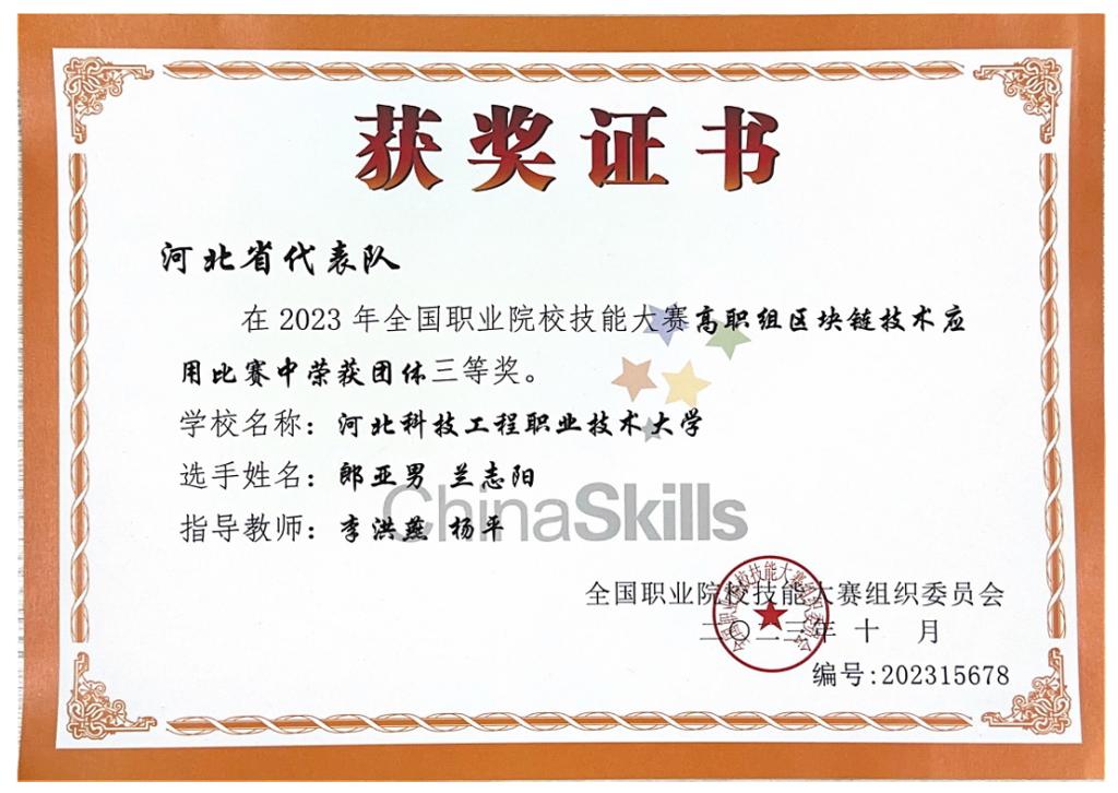 图:2023年全国职业院校技能大赛区块链技术应用全国三等奖
