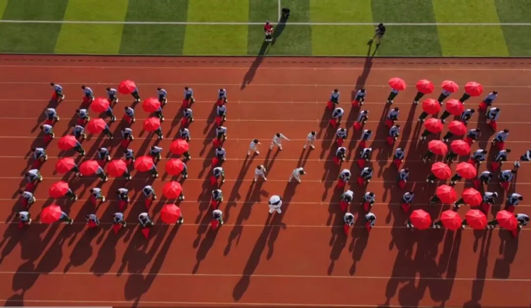 开幕式上,我院方队身着统一服装,昂首阔步,目光中满是坚定与昂扬。行至主席台时,方队成员们手中花伞瞬间变换阵型,先后拼出“1945”和“2025”的醒目字样,跨越八十年的时光,承载着对先辈的缅怀与历史的敬畏,“80”这不仅仅是时间的刻度,更是传承红色基因、守护和平的坚定誓言;紧接着,灵动的“AI”字母造型与活力四射的机械舞精彩衔接,这是科技与青春的碰撞,是传承与创新的交融。