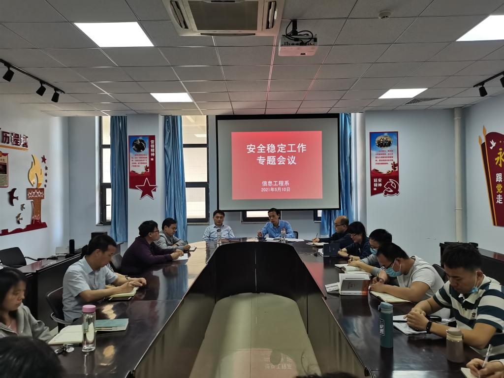 5月10日下午,我系在系党员活动室召开了安全稳定工作专题会议。系党政领导班子、各教研室负责人、教务干事及全体辅导员参加了会议,会议由系党总支书记黄小林主持。