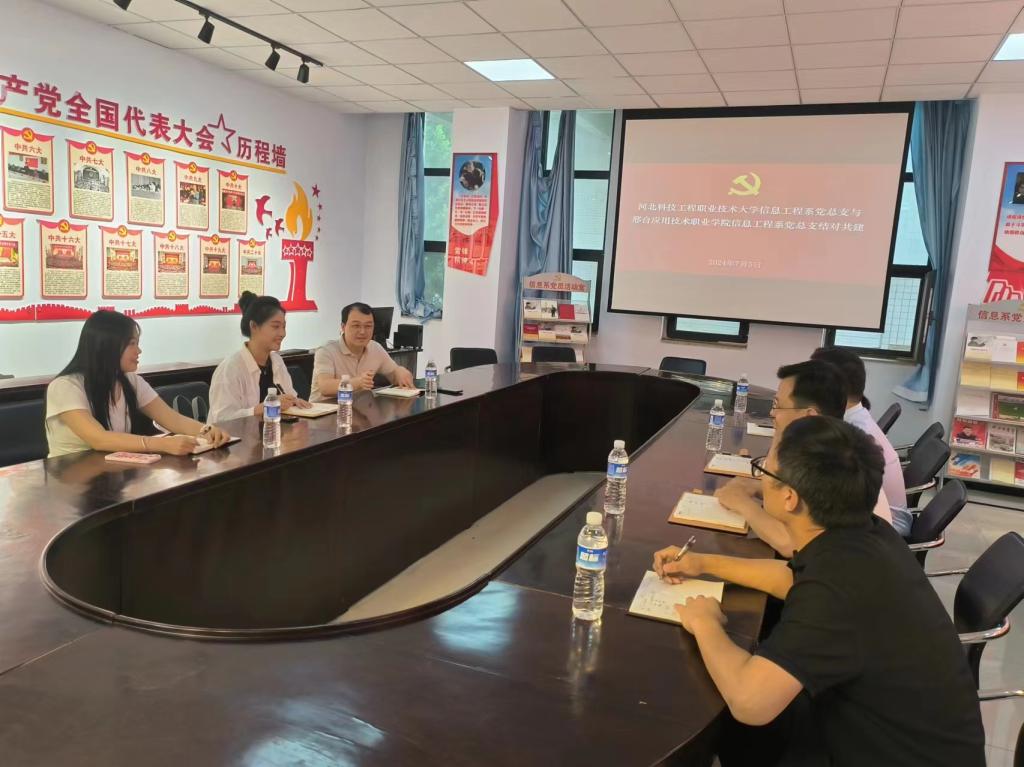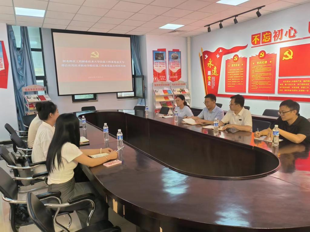 徐建平书记对邢台应用技术职业学院信息技术学院一行的到来表示热烈欢迎,并详细介绍了系部发展历程和党建工作情况。座谈会上双方就党组织建设、党建引领等方面开展探讨交流,建立联系。