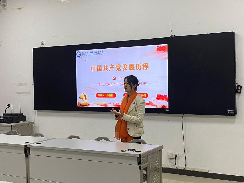 10月6日晚,系团总支书记马晓利为学员们讲解了“中国共产党发展历程”。她从新民主主义革命时期、社会主义革命和建设时期、改革开放和社会主义现代化建设时期三个阶段详细介绍了党的光辉历程和伟大成就,鼓励广大学员用新时代中国特色社会主义思想武装头脑,高举旗帜跟党走,坚定理想信念、练就过硬本领、锤炼高尚品格。