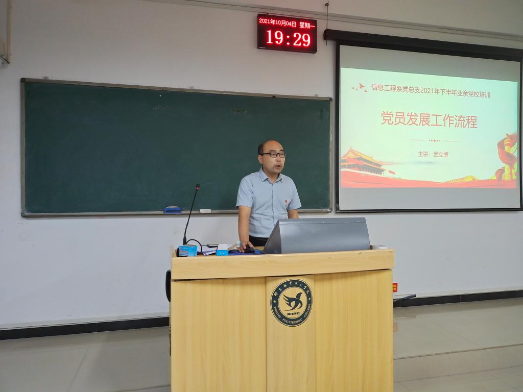 10月4日晚,系党总支副书记武立博以“党员发展工作流程”为题作了专题党课。他从申请入党、入党积极分子的确定和培养、发展对象的确定和考察、预备党员的接收、预备党员的教育考察和转正等发展党员工作的流程进行了详细讲解,并就发展党员工作中需要注意的问题进行了说明,希望全体培训班成员明确建设一支信念坚定、素质优良、纪律严明、作用突出的党员队伍的重要意义,积极向优秀党员学习,争取早日加入党组织。