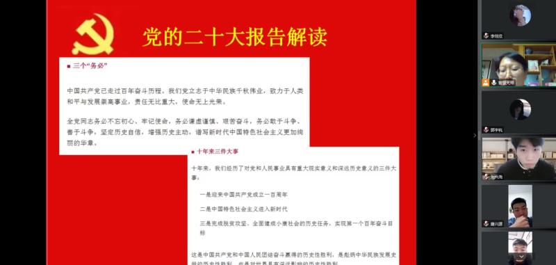 李慧琼老师围绕二十大大会主题、大会报告内容及大会重大意义三个方面进行了宣讲,带领大家共同学习了党的二十大中的中心任务、十年伟大变革、中国式现代化、四个坚持、五个必由之路、六个着力等关键词。李老师强调,学习宣传贯彻党的二十大精神是当前和今后一个时期的首要政治任务,希望大家用实际行动诠释总书记在二十大的报告中对青年“怀抱梦想又脚踏实地,敢想敢为又善作善成”的期望,时刻保持党员的思想先进性、积极性,做好模范表率,矢志奋斗不渝。