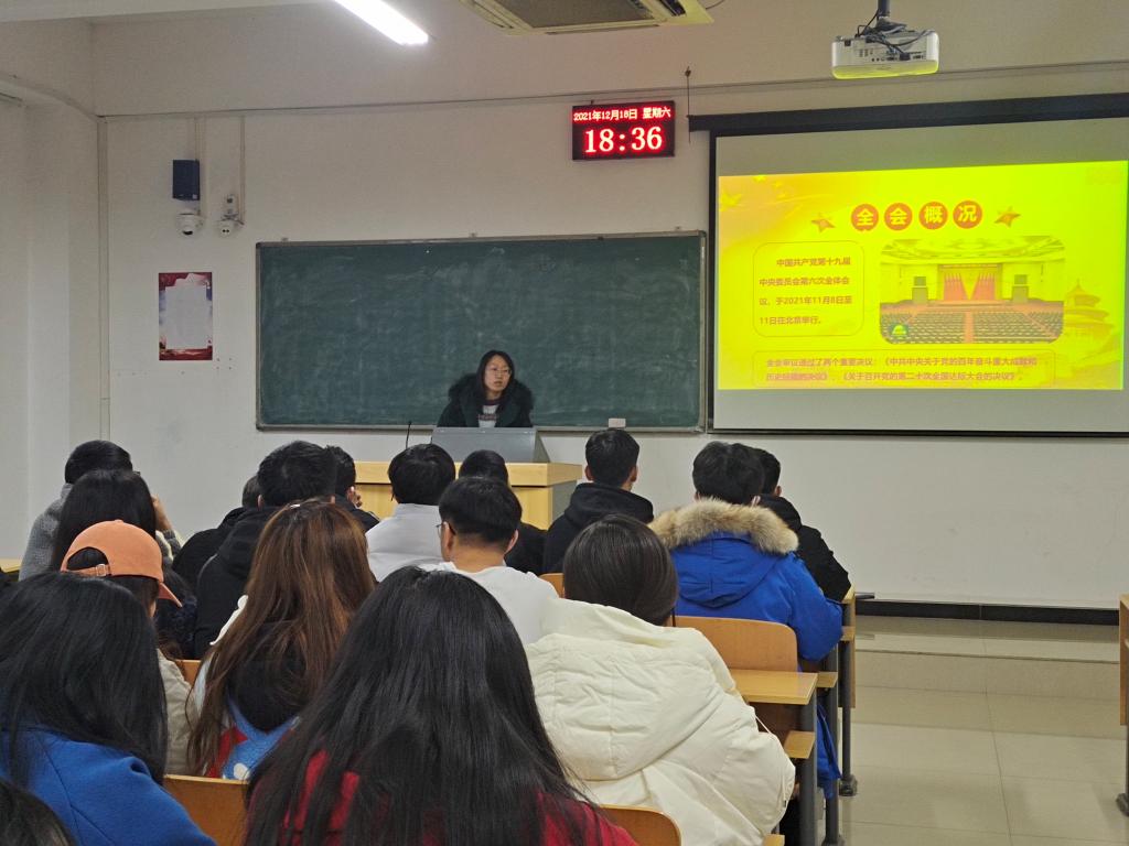 12月20日,系学生党支部书记李慧琼以“凝聚强大力量 奋进崭新时代”为题,宣讲了六中全会精神,全体学生发展对象聆听了宣讲;12月21日,系团总支书记马晓利以“新思想引领新征程”为题为全体团支部书记进行了六中全会精神学习辅导;各班级主管辅导员老师和“五包五进”教师也结合班级特色,把宣讲课堂搬到自习室、运动场、宿舍等学生工作阵地,通过座谈、研讨等方式开展了全会精神宣讲;12月18日-20日,学生党员骨干作为“新生导航计划”班级指导员,在顶岗实习岗位通过钉钉会议、腾讯课堂、微信群等线上平台,结合各自的实习体会为2021级各班新生做了全会精神学习辅导;12月22日-24日,优秀青马学员代表以“凝心聚力担使命,接续奋斗启新程”为主题走进班级开展了全会精神系列宣讲。