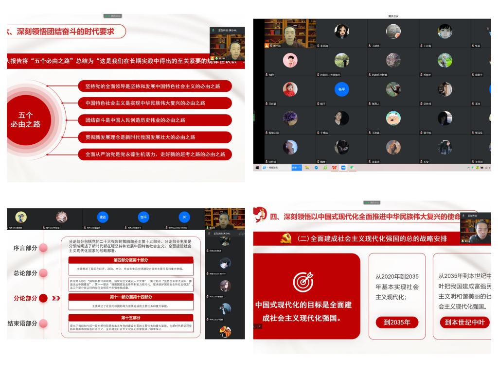11月29日晚,系党总支组织委员、学生党支部书记李慧琼以《做优秀党员,书时代华章》为题宣讲了党的二十大精神,全系学生党员、部分入党积极分子、2022年下半年发展对象聆听了宣讲;11月30日晚,系党总支副书记武立博以《踏上新征程,向着新的奋斗目标出发》为题,为全系学生党员、主要学生干部主讲了党的二十大精神主题党课;12月1日上午,系党总支书记黄小林以线上形式参加了网络专业本科班学生的班会,围绕学习贯彻党的二十大精神与学生进行了交流与分享;12月1日晚,系团总支书记马晓利以《学深悟透新思想 争做有为新青年》为题为各团支部书记、青年团员代表进行了党的二十大精神学习辅导;12月2日晚,系党总支纪检委员、教工党支部书记张小志以《守正创新、砥砺奋发,开启职教本科新篇章》为题,结合系部发展和职教本科建设,为全体教工党员宣讲了党的二十大精神。