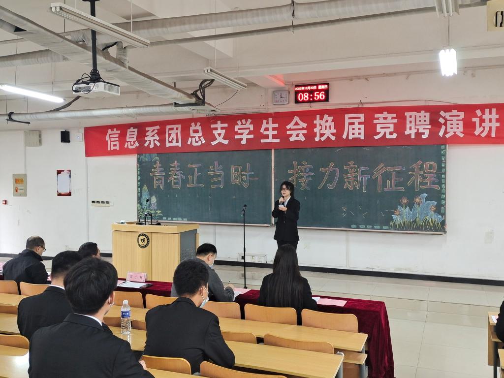 10月30日,我系在C区3-1教室召开了第十六届团总支学生会干部换届竞选演讲大会。本次竞选采取线上线下同时进行的方式,系党总支书记黄小林、副书记武立博、全体辅导员老师、49名候选人和其他团总支学生会成员参加了大会。竞选者们依照名单顺序依次上台发表演讲,同学们以饱满的热情、精彩的演讲,讲述了自己对所竞选职位和任职部门的见解认识,阐述了对团总支、学生会工作的清晰认知与展望,介绍了个人工作简历和自身优势,慷慨激昂的竞选演讲,赢得了老师和同学们的阵阵掌声。会上,由师生代表对所有候选人进行了逐一打分。