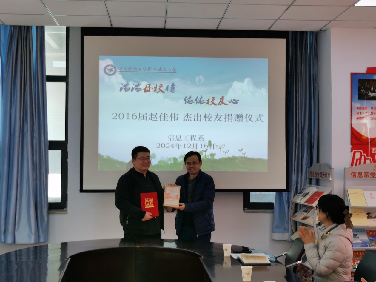 2024年12月16日,赵佳伟校友支持信息工程系建设捐赠仪式在系二楼党员活动室举行,系党总支书记徐建平、系主任冯磊、系副主任张小志及教师代表参加捐赠仪式。校友赵佳伟秉承回馈社会与感恩母校的初心,向母校捐赠了一套先进的VR设备,用于教学与科研,助力信息工程系在数字化教学领域的进一步发展。