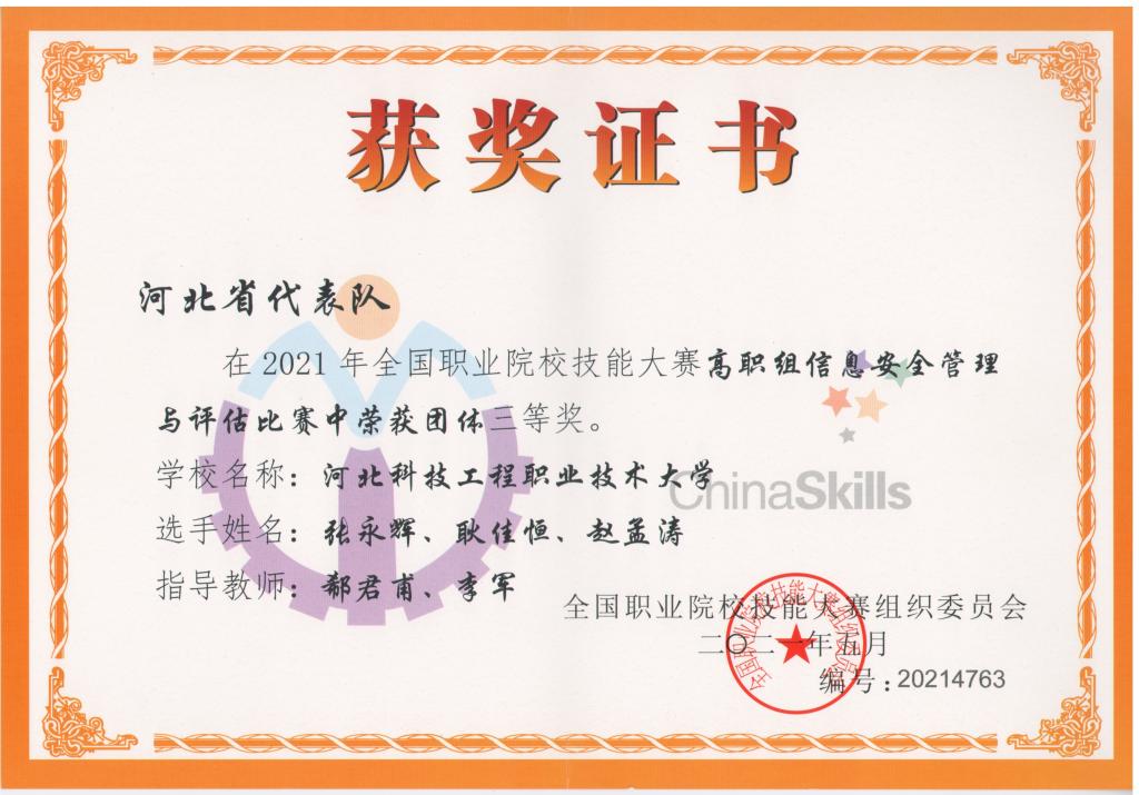2021年全国职业院校技能大赛高职组“信息安全管理与评估”赛项国赛于6月19日至20日在山东聊城开赛。按照“一省一队”原则从市赛、省赛脱颖而出的来自全国各地院校的30支参赛队伍同台竞技,历练技能、展示风采。经过7.5个小时的激烈比拼,由我系郗君甫、李军老师指导的(张永辉、耿佳恒、赵孟涛)代表队获得该赛项三等奖,排名10/30。