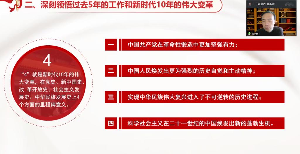 班会上,黄小林书记从“深刻认识党的二十大报告召开的重大意义、加深理解党的二十大报告主题、认真学习党的二十大报告的主要内容”等三个方面,结合“党的二十大主题、重要成果、过去五年的工作和新时代十年的伟大变革、全面建设社会主义现代化国家的目标任务”等关键词,与同学们进行了交流与分享。
