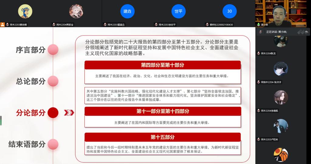 为深入学习宣传贯彻党的二十大精神,引导青年学生坚定不移听党话、跟党走,12月1日上午,系党总支书记黄小林通过参加线上主题班会的形式,为我系网络专业本科班的学生宣讲了党的二十大精神。
