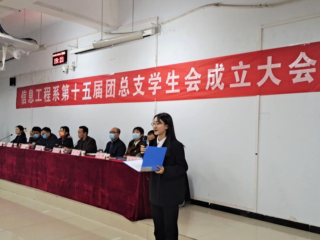 大会伊始,全体起立齐唱共青团团歌《光荣啊,中国共青团》,会议在庄严肃穆的气氛中拉开了帷幕。会上,武立博副书记宣读了《信息工程系关于第十五届团总支、学生会干部任命的决定》,李慧琼老师宣读了《信息工程系关于表彰2021级指导员、带班员突出贡献个人和优秀个人的决定》,与会领导、老师依次为第十五届团总支、学生会干部和2021级班委颁发了聘书,为2021级指导员、带班员突出贡献个人和优秀个人颁发了荣誉证书。随后,新任团总支副书记李佳欣同学代表新一届团总支、学生会作表态发言,对新学年团总支、学生会工作提出了规划和展望,表明了信心和决心。