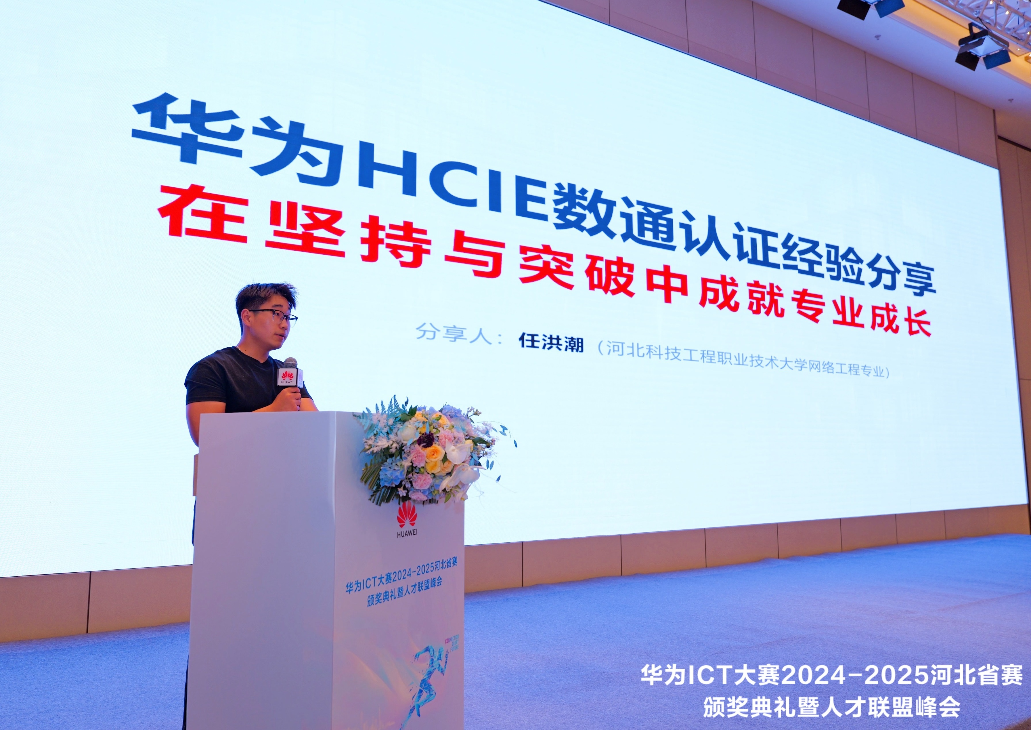 网络工程专业学生任洪潮作为HCIE认证精英班优秀学员,以《在坚持与突破中成就专业成长》为题,生动讲述了备考HCIE的奋斗历程。他用“感恩、坚持、突破”三个关键词,回顾了在校企双导师指导下攻克技术难点、完成200+小时实验训练的成长故事,并特别感谢学校“理论+实践+场景化实战”的培养模式为其奠定的扎实基础。任洪潮提到,HCIE认证不仅是技术能力的证明,更培养了他“分层分域”解决问题的工程思维。他的发言展现了职业本科学生追求卓越、勇攀技术高峰的精神风貌,引发会场热烈反响。