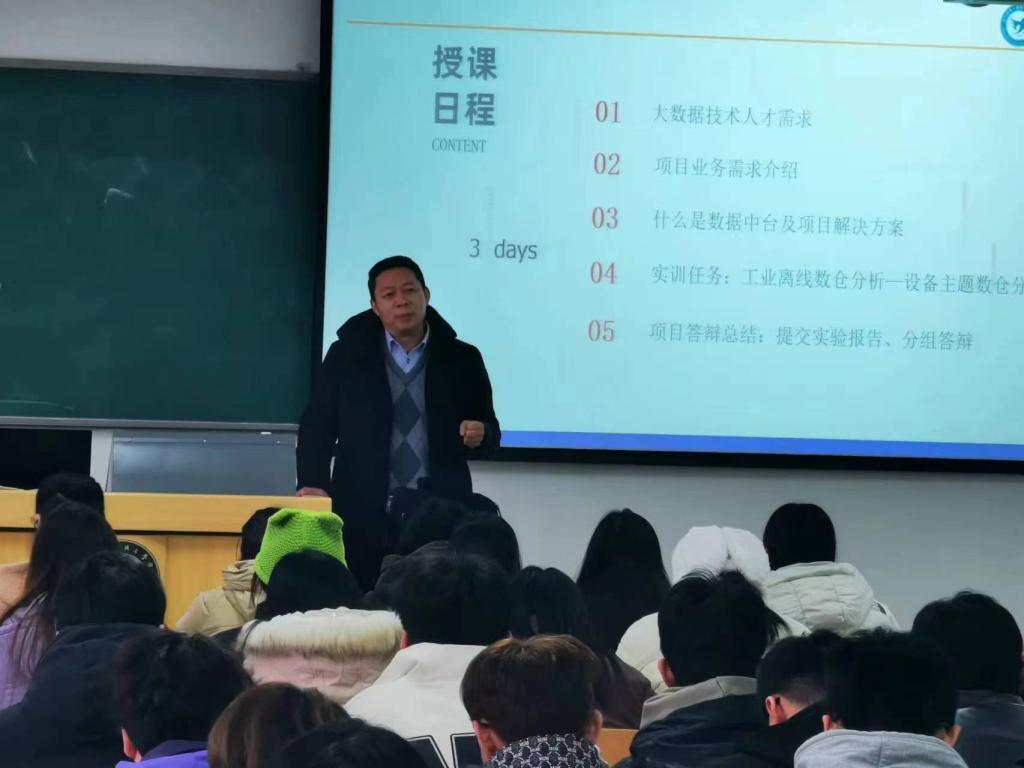 12月19日下午,新道公司大数据学院事业部的李荣贵老师与两位助教老师来到365官网,首先在多媒体教室向同学们介绍了工业大数据项目的典型应用场景、数据中台以及相关课程等。