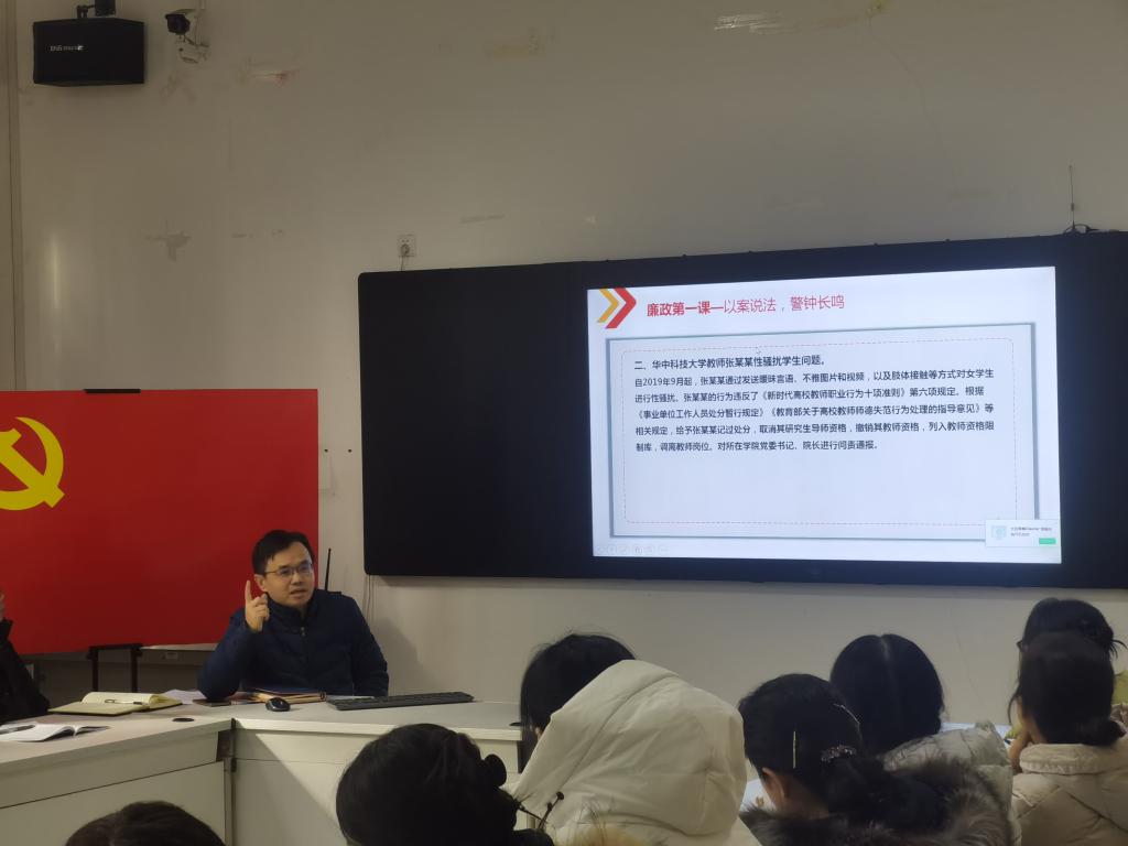 为加强我系廉政教育和师德建设,2月26日上午,我系在新学期第一次教职工大会上开展了“廉政第一课”,系党政领导班子及全系教工参加,系党总支纪检委员张小志担任主讲。