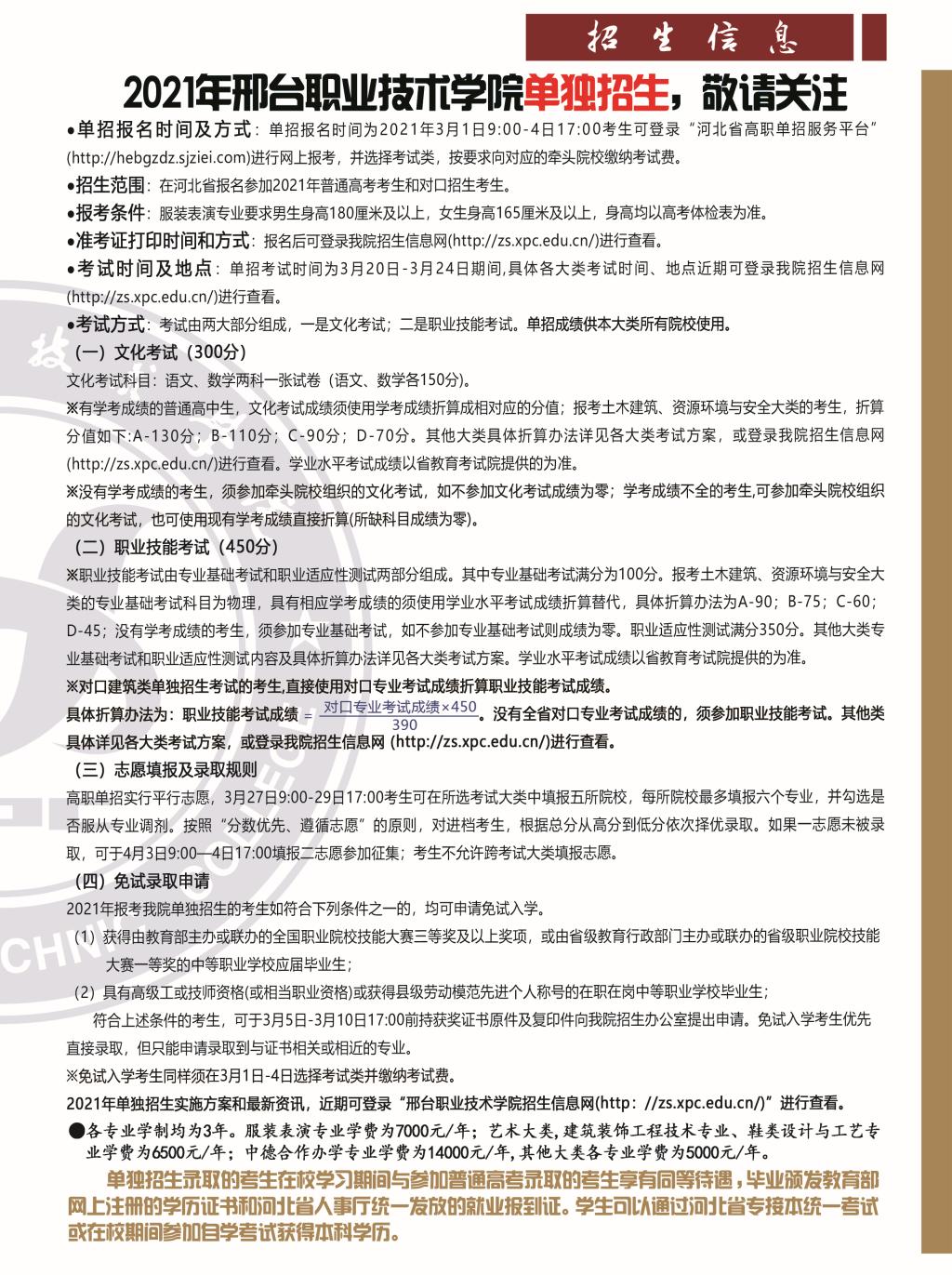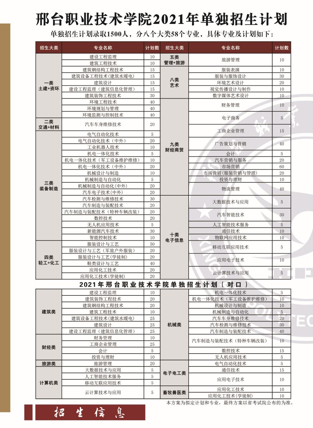 邢台职业技术学院2021年单独招生计划