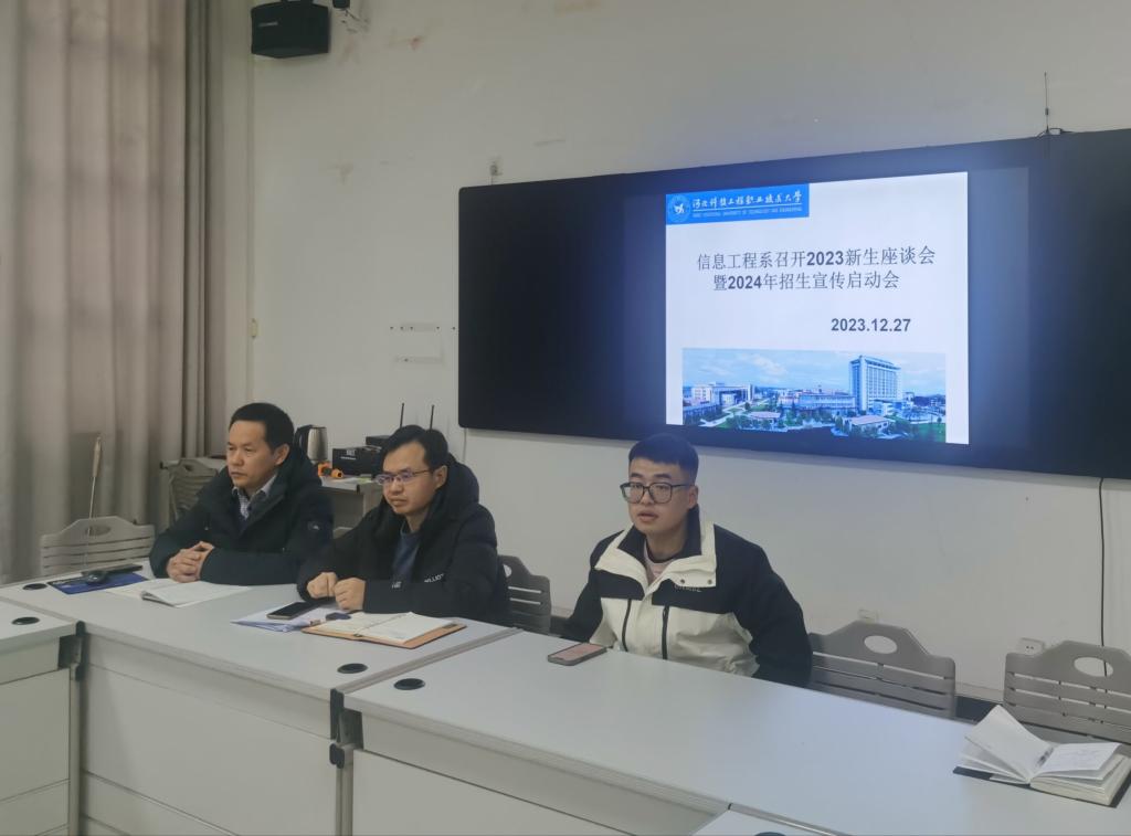 为进一步优化招生宣传方式,持续提高生源质量,落实学校职教本科人才培养政策,更好地做好招生宣传工作,信息工程系于12月27日下午在西校B区112会议室召开2023新生座谈会暨2024年招生宣传启动会。参加本次座谈会的有学校招生就业处刘柏林老师、信息工程系副主任张小志老师、信息工程系负责招生宣传的董会国老师、学生辅导员孙新博老师以及2023级来自邯郸片区、海南和甘肃的学生代表。