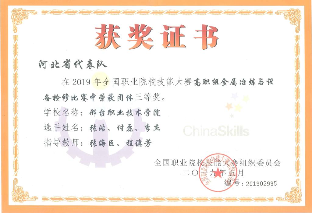 2019年全国职业院校技能大赛高职组“金属冶炼与设备检修”赛项决赛于5月18日下午在天津工业职业学院顺利闭幕。来自全国14个省市、自治区,24所高职院校,共72名参赛选手参加了比赛。我院资源与环境工程系主任赵建国带队,资源与环境系工程张海臣老师和电气工程系程德芳老师指导的李杰、张浩、付磊3名同学代表河北省参加了比赛。
