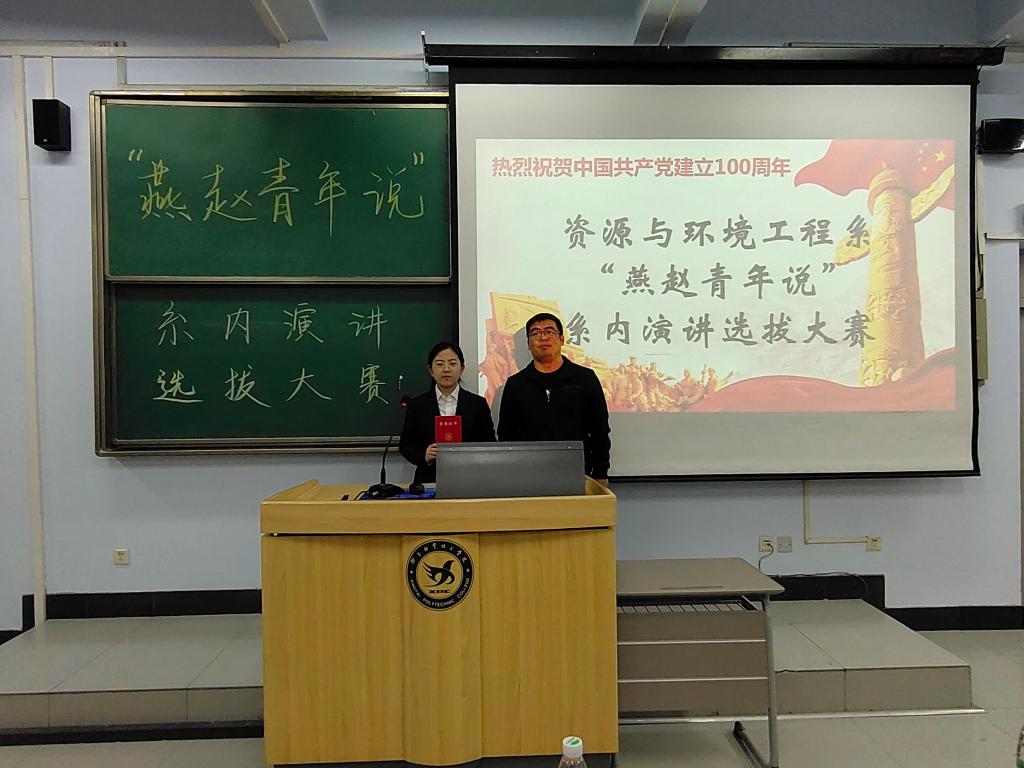 为深入学习贯彻习近平新时代中国色社会主义思想,全面贯彻党的十九届五中全会精神,引导广大青年学生积极学习党史,4月18日晚上7点,我系在主教1-1举办了以“燕赵青年说”为主题的系内演讲选拔大赛。应邀出席本次大赛的评委有李传文老师、郭京豪老师、王园圆老师、邓宏颖老师和张志华老师,观众为19级、20级学生干部。