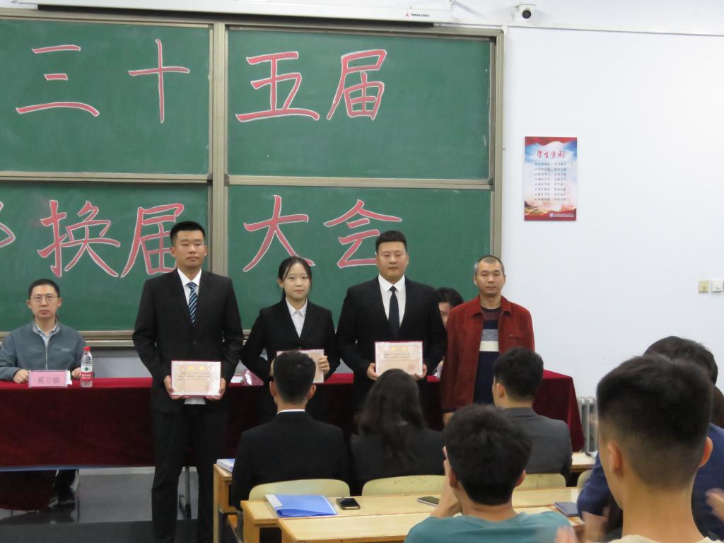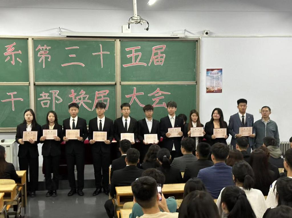 会议伊始,李莉老师宣读了第三十五届团总支学生会干部名单,并为学生干部颁发聘书、合影留念。随后,第三十四届学生会负责人田鑫鑫回顾了担任学生会干部工作经历,总结了过去一年的工作经验和心得感悟,希望新一届学生干部以身作则,严于律己,秉承优良作风,起好学生干部带头作用,为系与学校的发展贡献自己一份力量。紧接着第三十五届学生会负责人毛羽丰发言,他表示将会带领新一届学生干部创新工作方式,提升工作能力,以饱满的热情对待工作,不懈努力,砥砺前行。